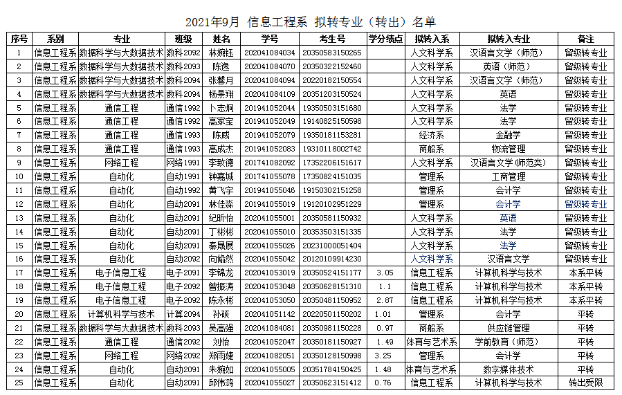 根据《集美大学诚毅学院学籍管理规定(修订)》(诚毅教综[2020] 8号)、《关于做好我院2020级学生2021-2022学年第一学期转专业工作的通知》等文件精神,经学生申请,教学系(院)审核,以下24名学生符合转专业转出条件,拟同意转出本系,另1名学生超出本专业转出名额。详情见附件。