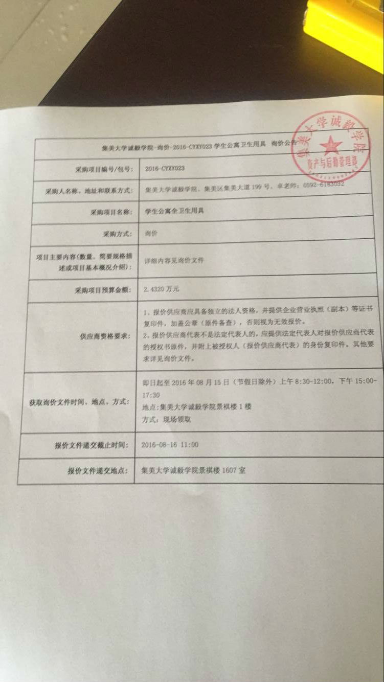 集美大学诚毅学院学生公寓卫生用具询价公告(2016-cyxy023)
