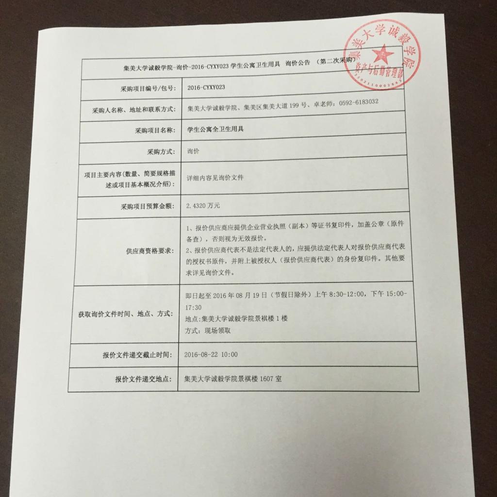 集美大学诚毅学院学生公寓卫生用具第二次询价公告(2016-cyxy023)