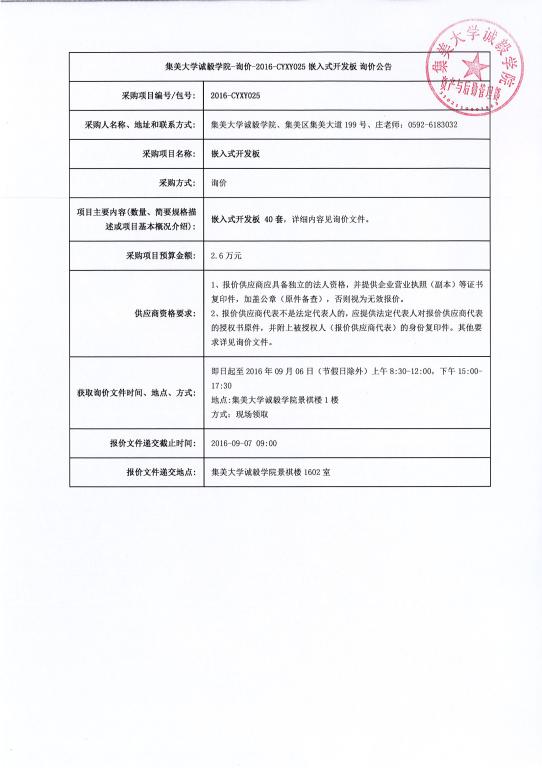 集美大学诚毅学院嵌入式开发板询价公告(2016-cyxy025)