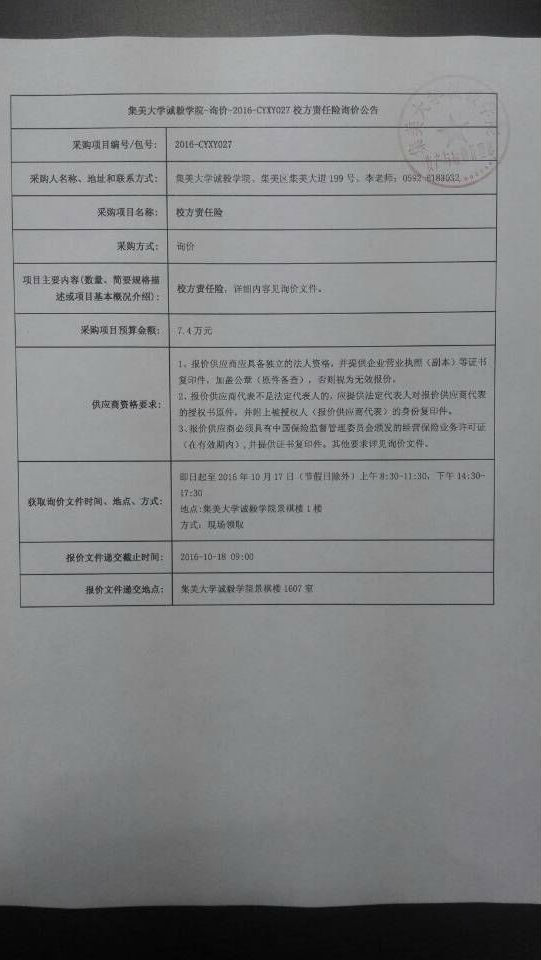 集美大学诚毅学院校方责任险询价公告(2016-cyxy027)
