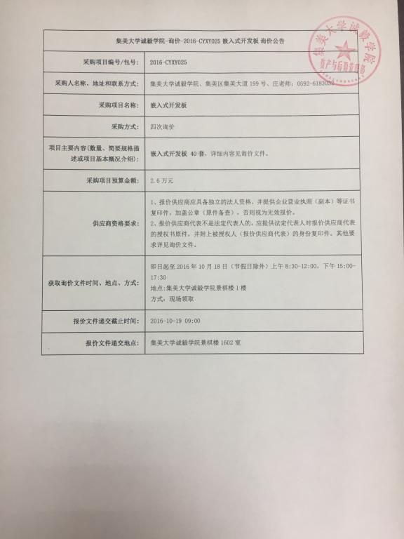 集美大学诚毅学院嵌入式开发板询价四次公告(2016-cyxy025)