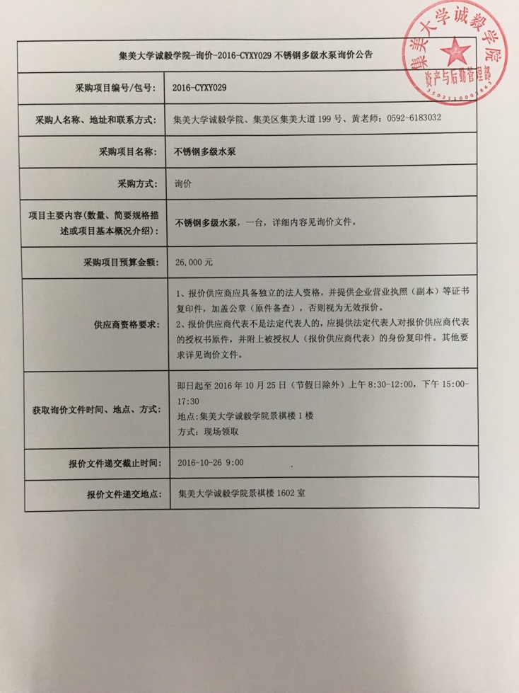 集美大学诚毅学院不锈钢多级水泵询价公告(2016-cyxy029)