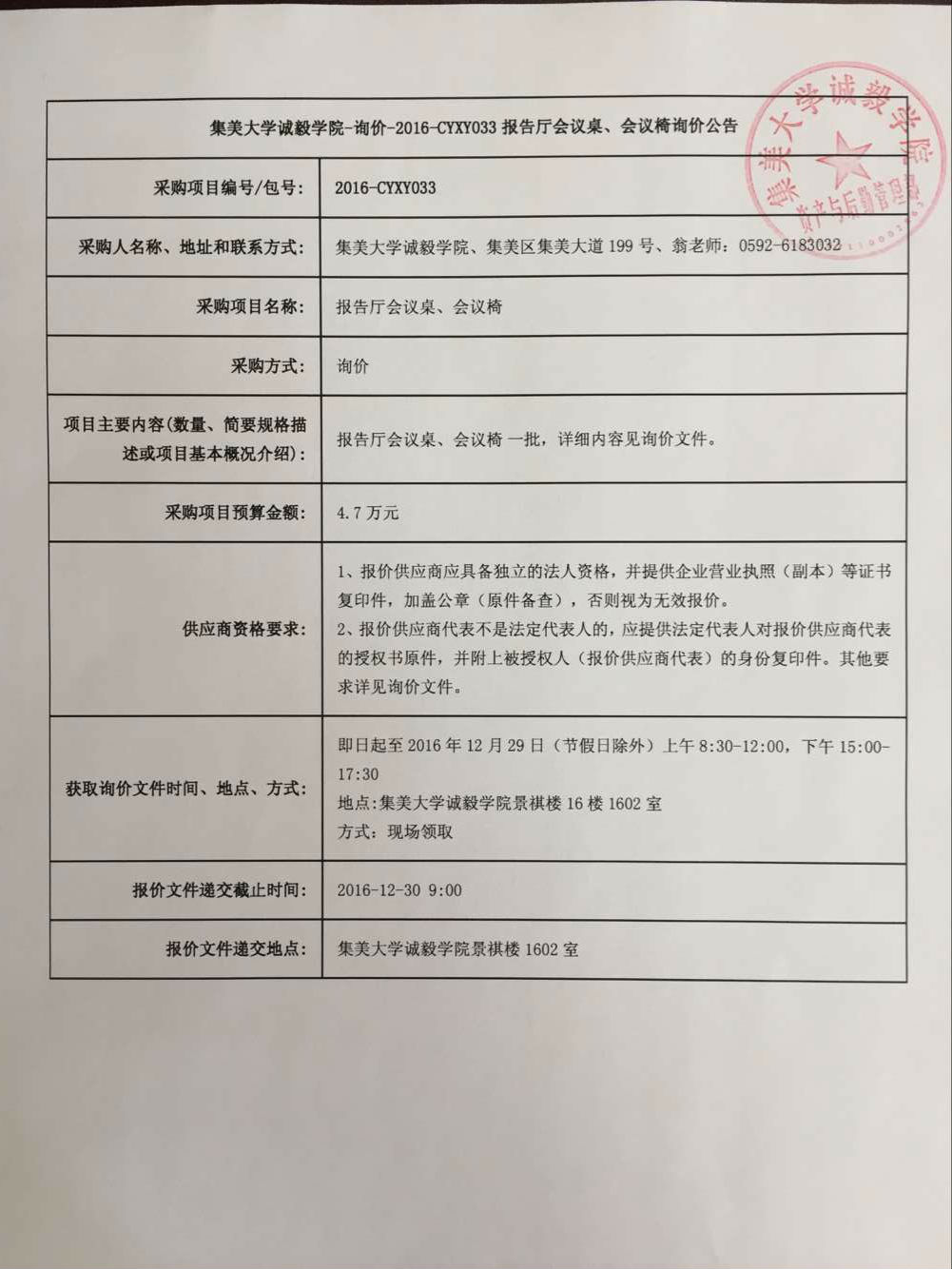 集美大学诚毅学院报告厅会议桌、会议椅询价公告(2016-cyxy033)