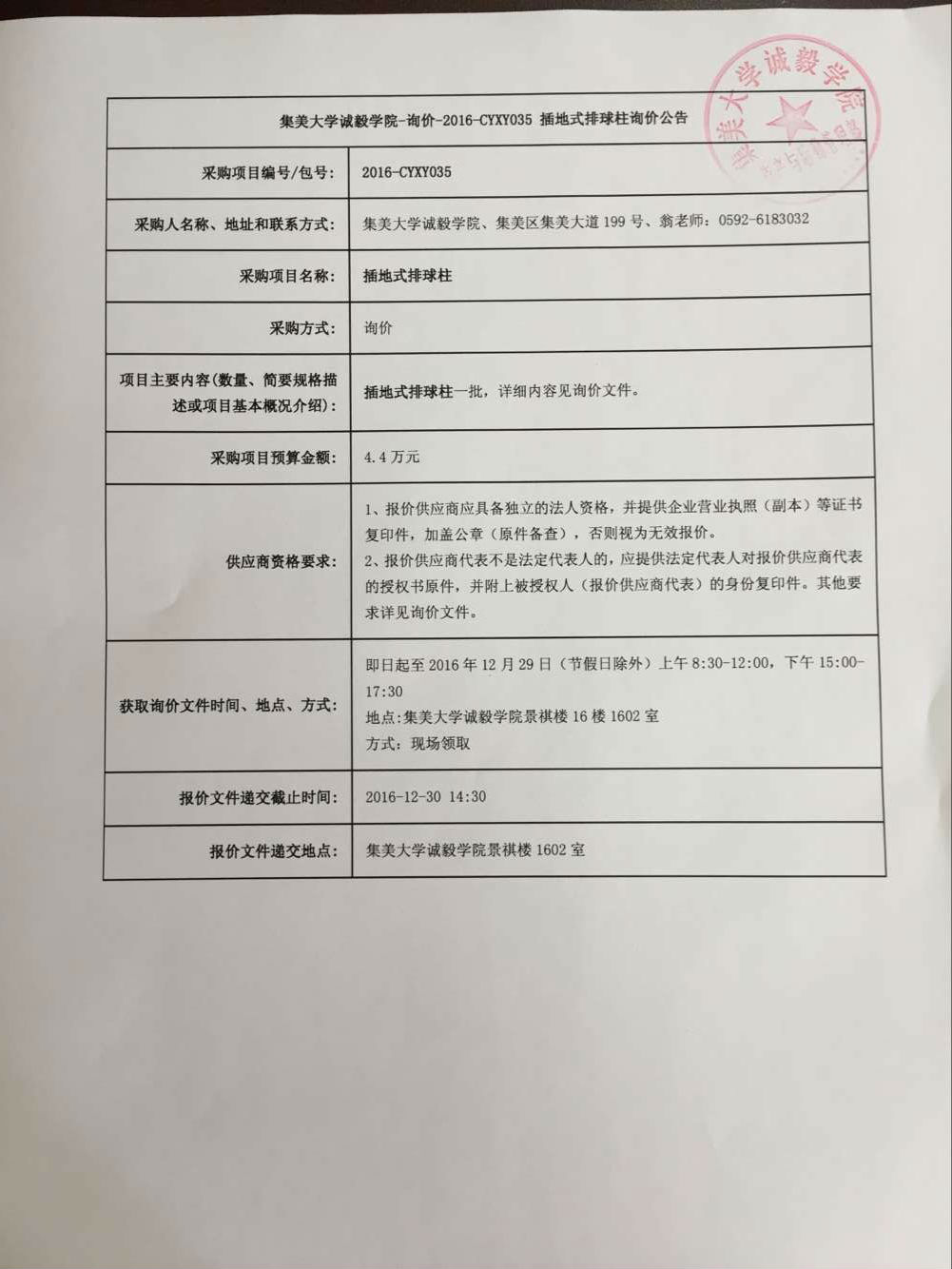 集美大学诚毅学院插地式排球柱询价公告(2016-cyxy035)