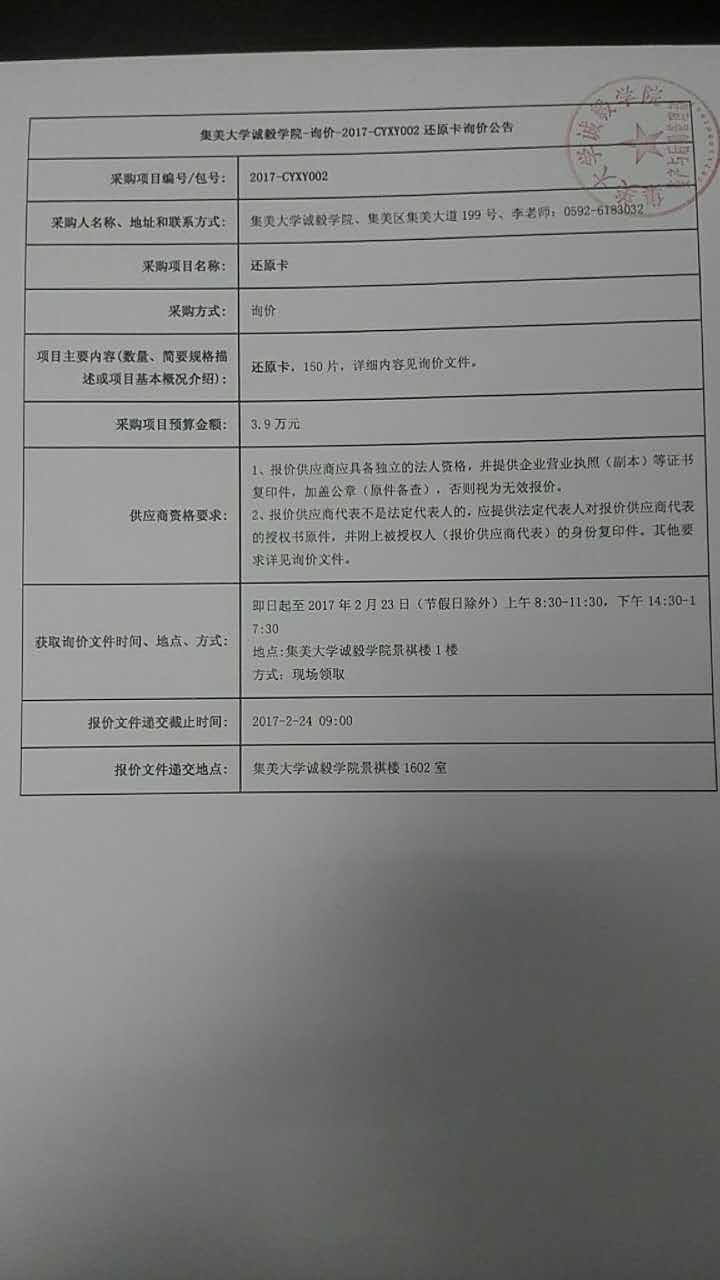 集美大学诚毅学院还原卡询价公告(2017-cyxy002)