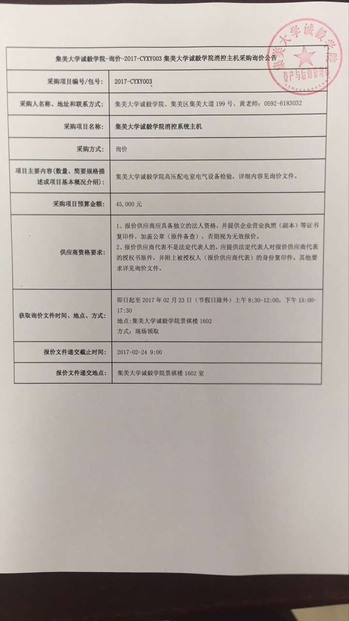集美大学诚毅学院消控主机询价公告(2017-cyxy003)