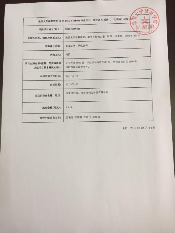 集美大学诚毅学院毕业证书、学位证书询价结果公示(2017-CYXY004