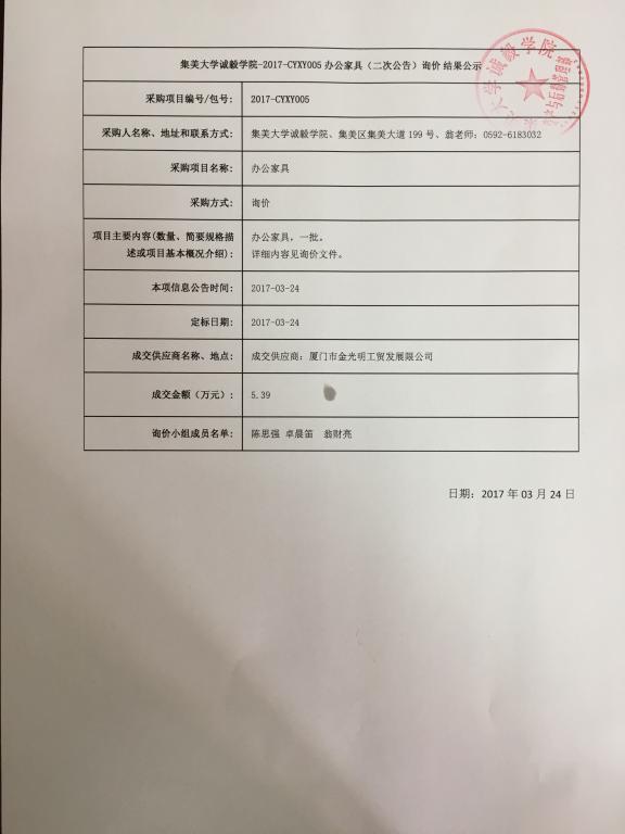 集美大学诚毅学院-2017-CYXY005办公家具(二次公告)询价结果公示