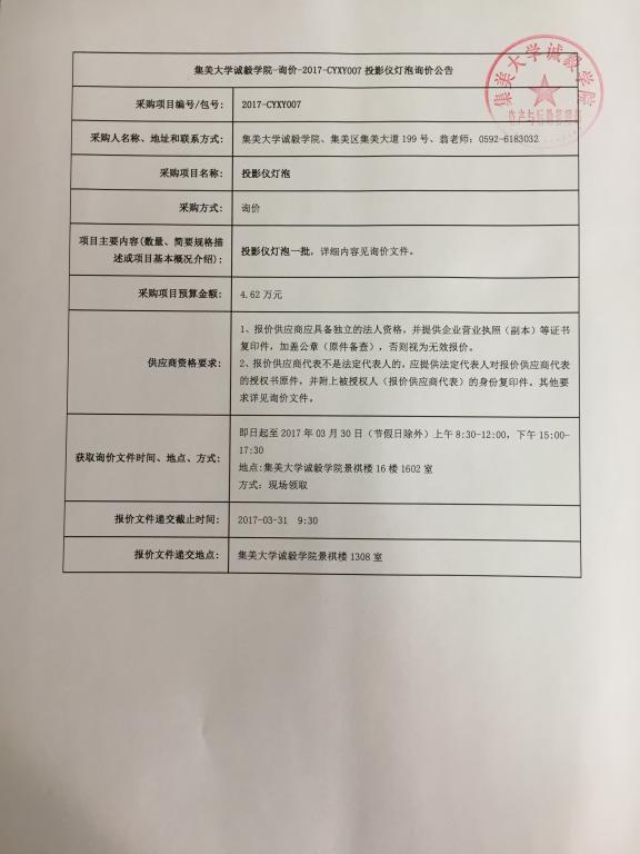 集美大学诚毅学院-询价-2017-CYXY007投影仪灯泡询价公告