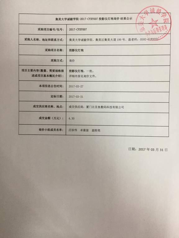 集美大学诚毅学院-2017-CYXY007投影仪灯泡询价 结果公示