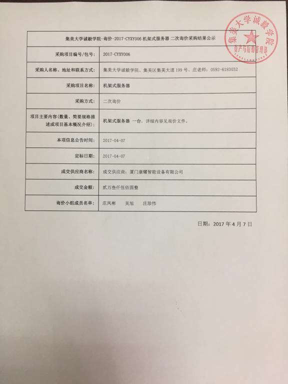 集美大学诚毅学院机架式服务器二次询价采购结果公示(2017-cyxy006)