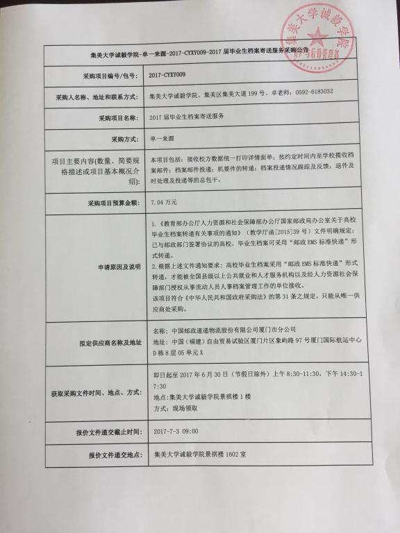 集美大学诚毅学院-单一来源-2017-CYXY009-2017届毕业生档案寄送服务采购公告