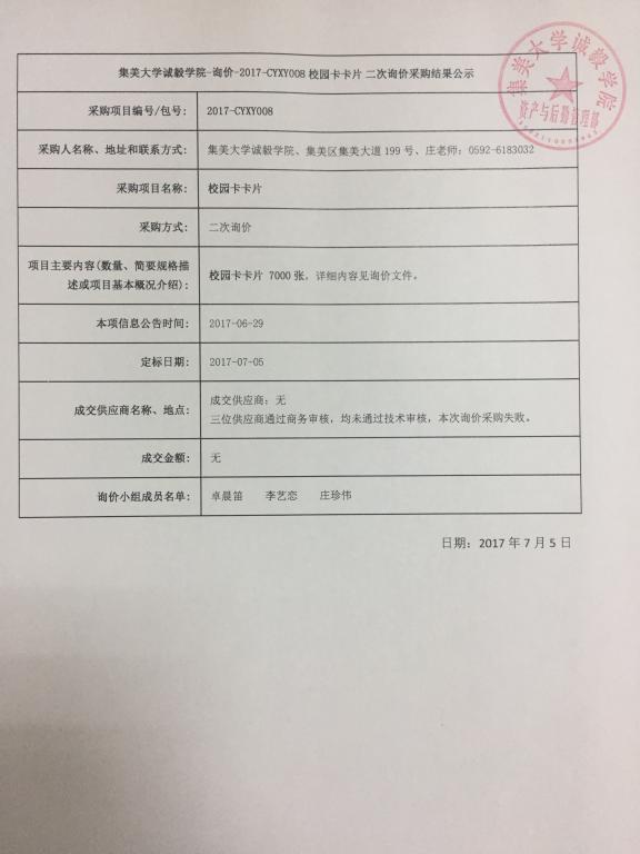 集美大学诚毅学院-询价-2017-CYXY008校园卡卡片 二次询价采购结果公示