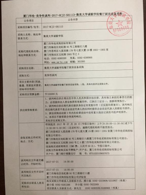 厦门华沧-竞争性谈判-2017-HCJZ-SH1113-集美大学诚毅学院餐厅厨房设备采购