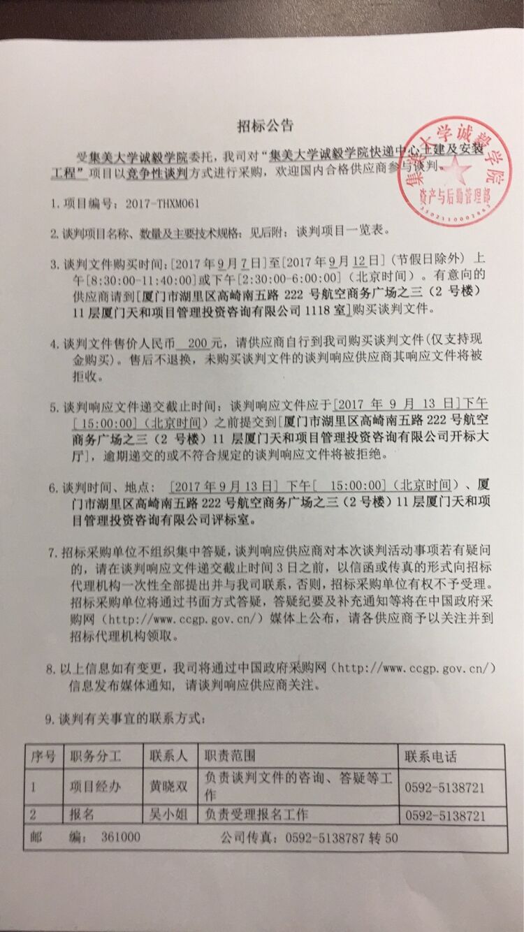 厦门天和- 2017-THXM061 -集美大学诚毅学院快递中心土建及安装工程-竞争性谈判公告