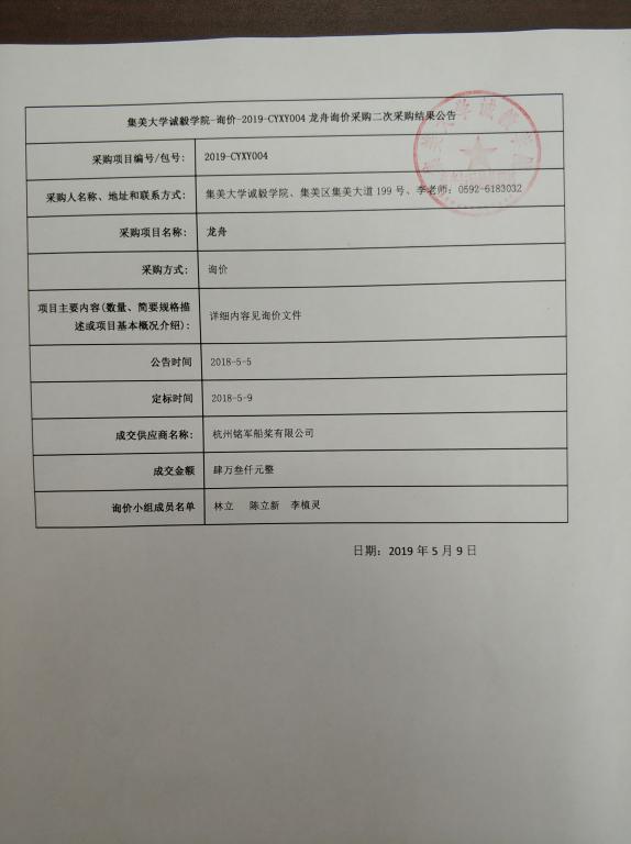 集美大学诚毅学院-询价-2019-CYXY004龙舟询价采购二次采购结果公告