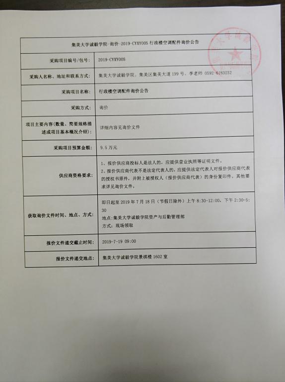 集美大学诚毅学院-询价-2019-CYXY005行政楼空调配件询价公告