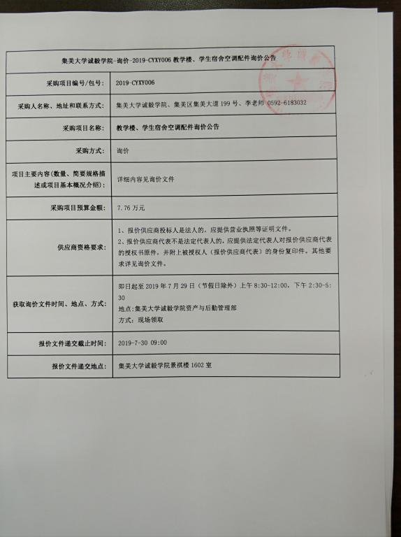 集美大学诚毅学院-询价-2019-CYXY006教学楼、学生宿舍空调配件询价公告