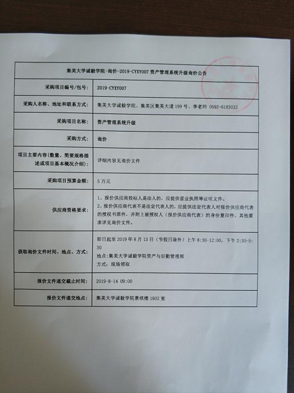 集美大学诚毅学院-询价-2019-CYXY007资产管理系统升级询价公告