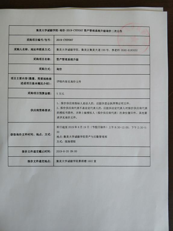 集美大学诚毅学院-询价-2019-CYXY007资产管理系统升级询价二次公告