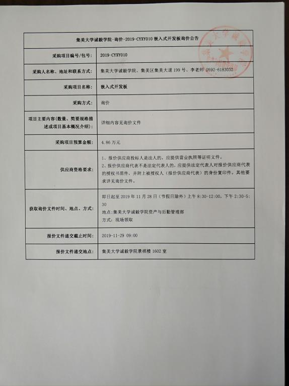 集美大学诚毅学院-询价-2019-CYXY010嵌入式开发板询价公告