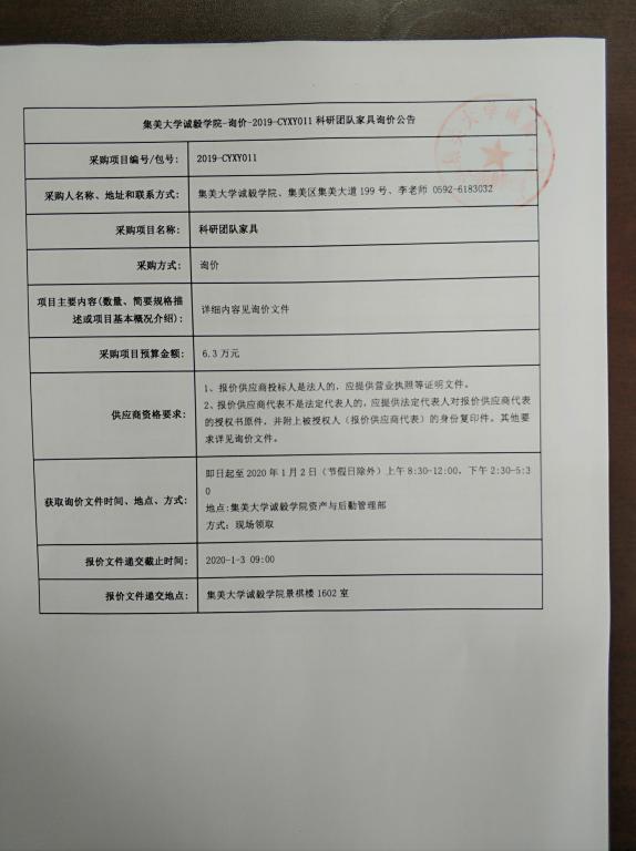 集美大学诚毅学院-询价-2019-CYXY011科研团队家具询价公告