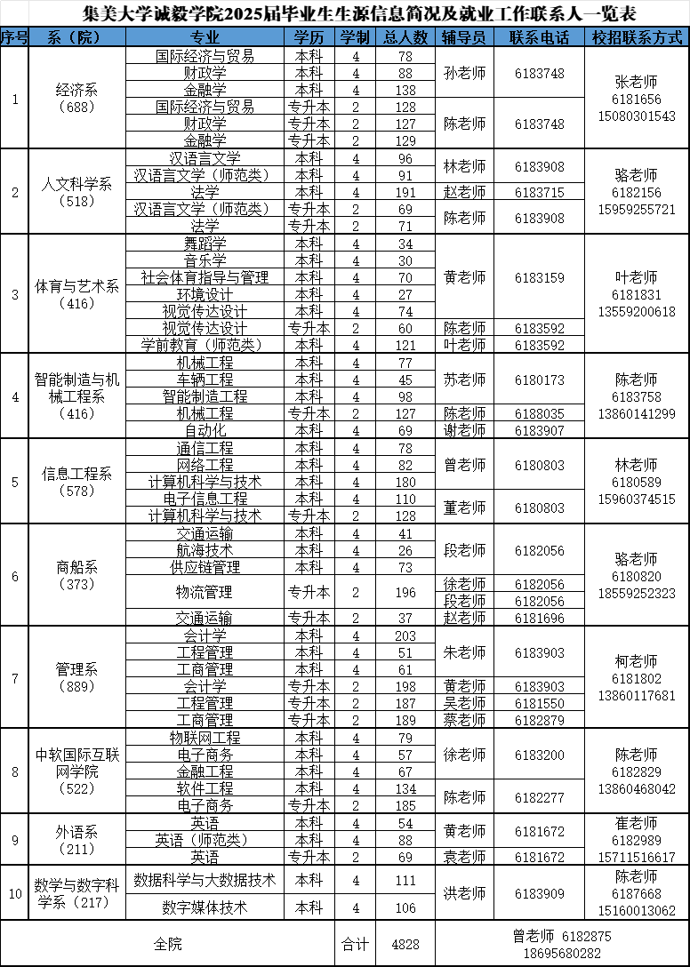 集美大学诚毅学院2025届毕业生生源信息简况及就业工作联系人一览表